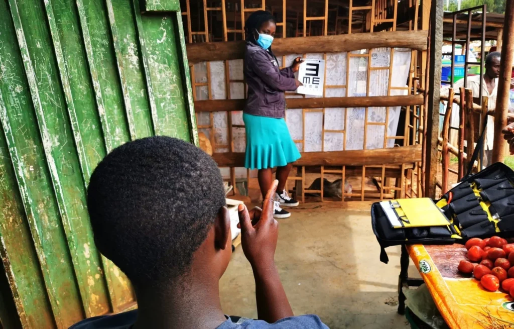 A DOT Glasses entrepreneur providing eye tests in rural Kenya
